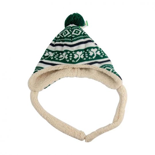 Toddler sized knitted hat with shamrock design. Shamrock and stripes pattern of green, white, blue with green pom pom on the top. A contrasting off white/light brown furry lining and ties both accent the hat and add comfort and warmth for the Wee One wearing it. Take a look at the matching reversible jacket/sweater BOE125. Acrylic knit and polyester lining.