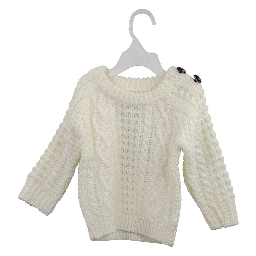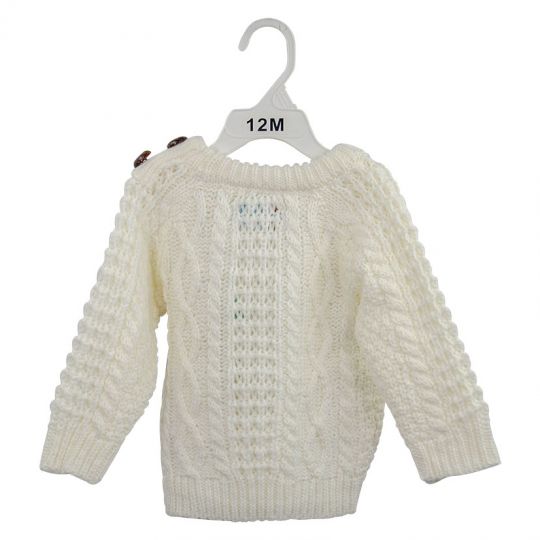 Our lovely handwoven acrylic crew is embellished with two buttons at the shoulder. Sizes are 12M and 24M.
