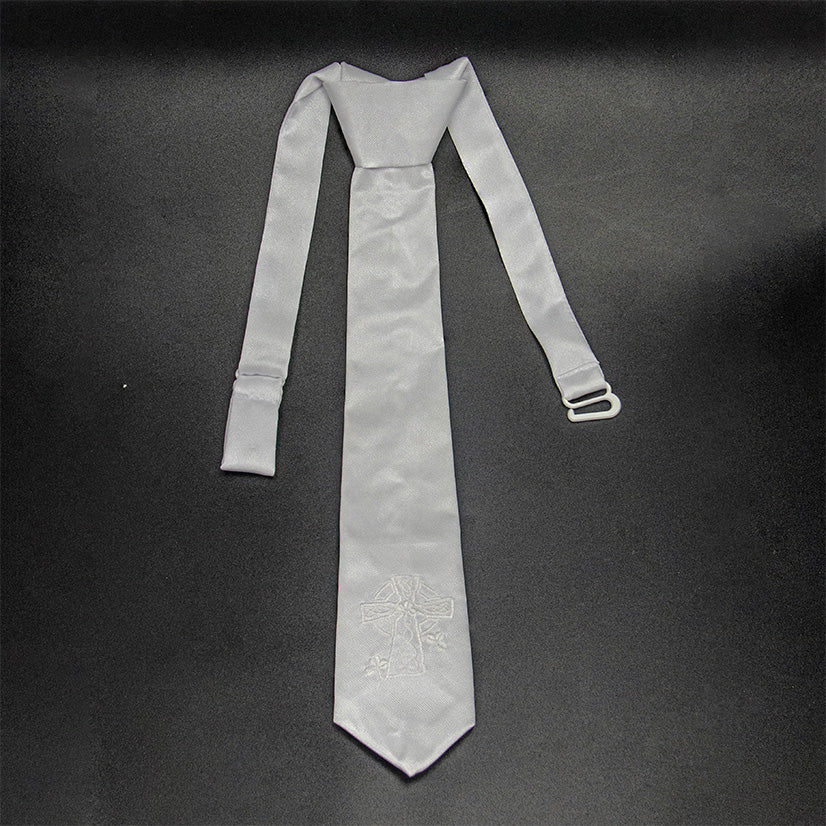 embroidery of a Celtic cross in white thread. It has an adjustable strap. It also can be kept as an heirloom for future generations. Sateen.