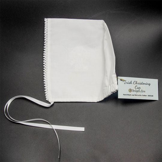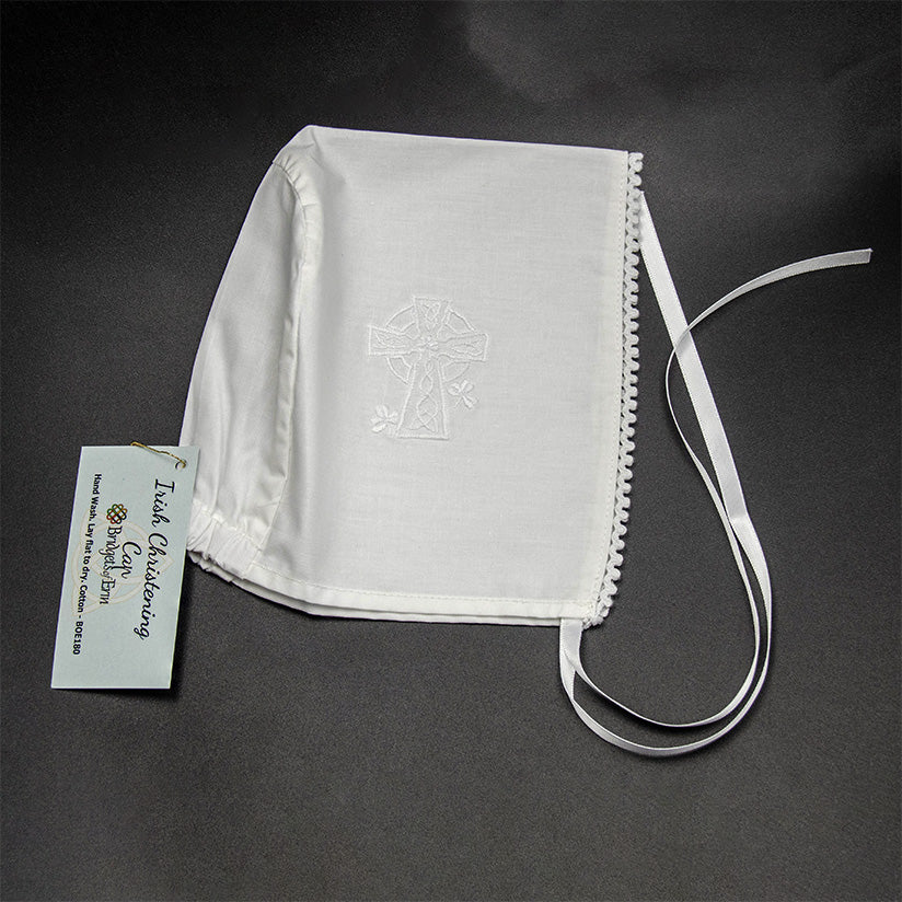 Such a special cap to celebrate a Christening. Beautifully embroidered with a Celtic Cross. 5 x 5 inches. Cotton. Presented in a lovey lace and silk-like transparent cloth bag tied with delicate ribbons. The bag allows the embroidery to be admired while providing a wonderful way to store the keep sake for passing to future generations.