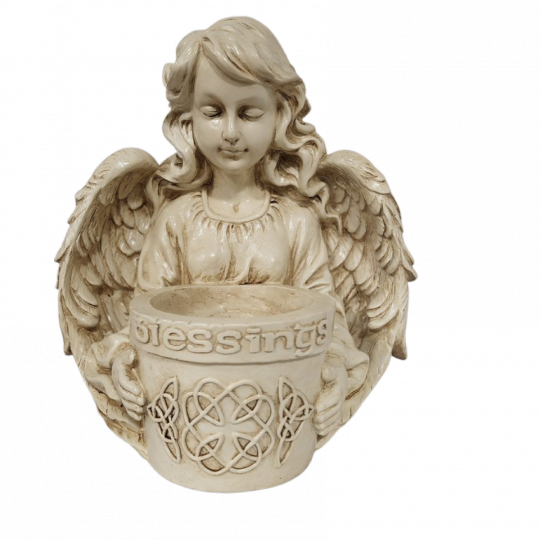 Blessings Angel Planter. 11.8 x 9.25 x 12.6 in. Inside pot 3.25 in. deep x 4.25 in diameter. Resin. A beautiful Celtic Knot adorns the front of this Angel's planter and displays the word BLESSINGS to all. ARRIVES END OF SEPTEMBER.