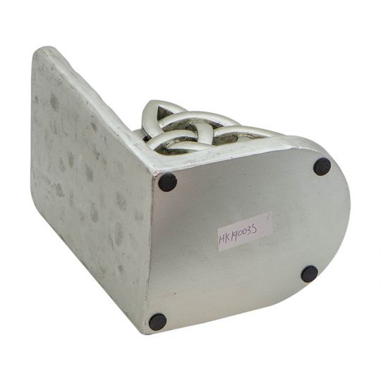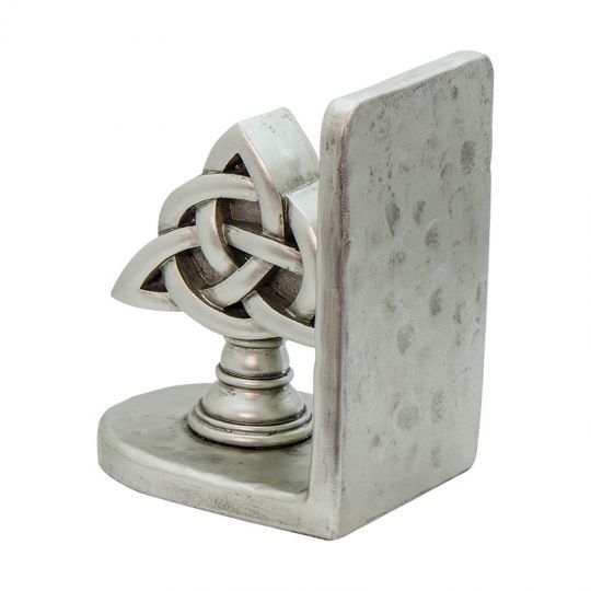 It is a great embellishment to your bookcase.  These silver-toned, almost pewter colored set of bookends are simple in design yet a very classic and elegant decor item.  They are made of cold cast resin - heavy to hold books in place.  Each one measures 6.5 inches x 5 inches x 4 inches.