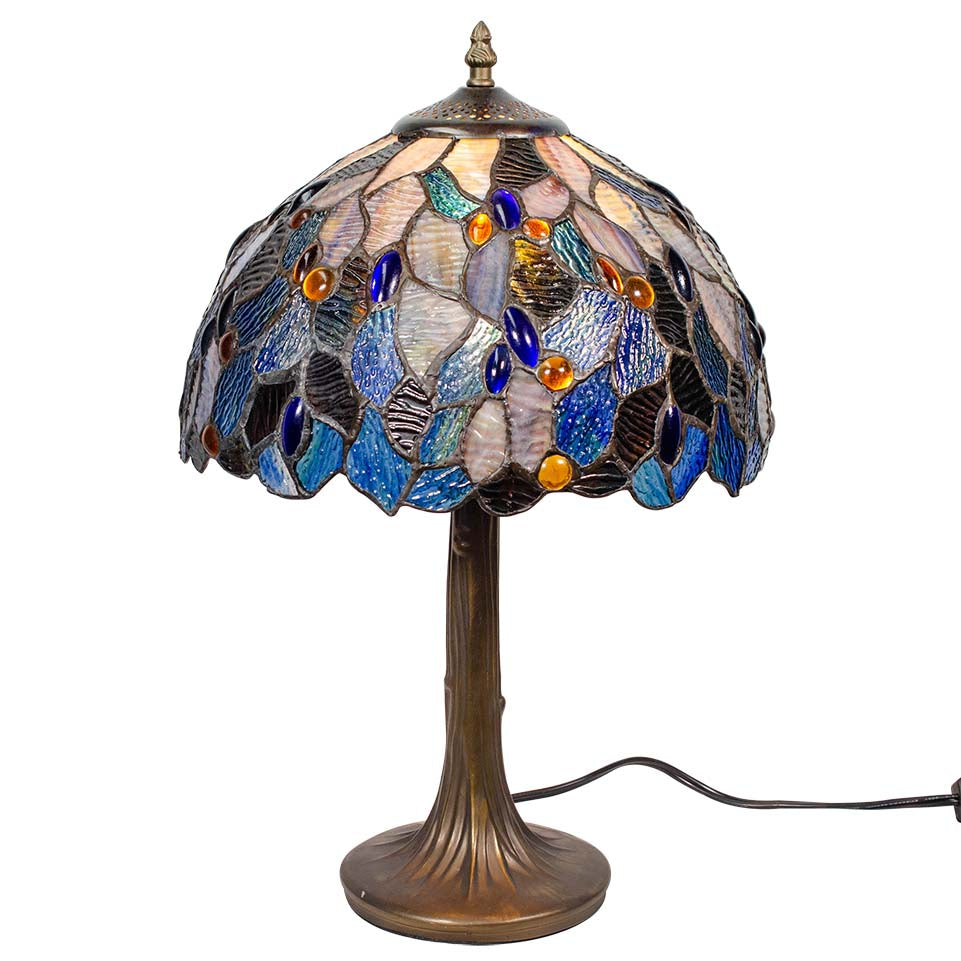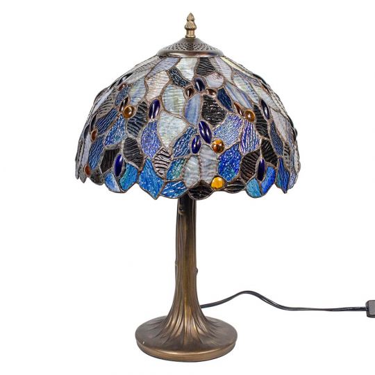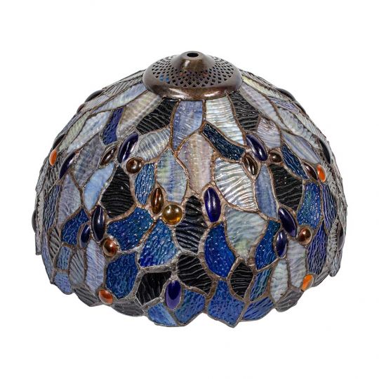 Glass in an arrary of blues, greens, and violets form the images of small shaded pools of water with rocks and logs that take on the colors of nature around it. It might be said these are the reminents of the Irish fairy forts of ancient times. Available in 2 sizes: 16" diameter shade and a 12" diameter shade.