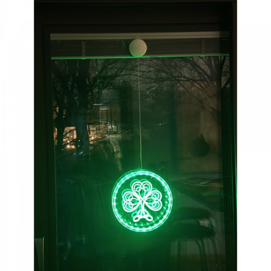 A bright neon, battery powered Celtic shamrock window ornament to show your Irish pride. It lights up all green. The etched shamrock in the center is surrounded by green lights. A 17.5 inch cord attaches to the top of the ornament on one end and on the other it attaches to a round battery box - which comes with adhesion strip for attaching to your window. It runs of 3 AAA batteries and is 8.75 inches in diameter. Plastic. LED lights