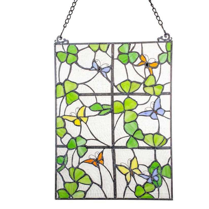 This Stained Glass piece is like looking out a window into a garden of Shamrocks,vines and butterflies. The multiple shades of green are accented with burts of red, yellow, and blue among a 6 pane window.   12" X 16". Comes with two feet of chain to hang the panel.