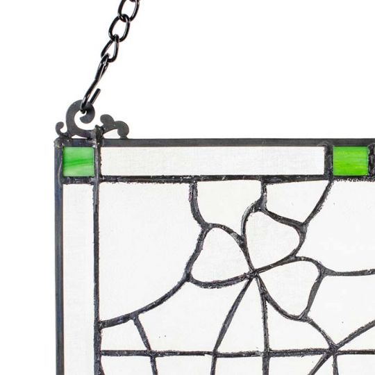 Multi-textured glass with bevelled shamrocks creates lovely glass shamrocks and vines. Green hints of stained glass add just enouth Irish color. 12" x 16". Comes with two feet of chain to hang the panel.