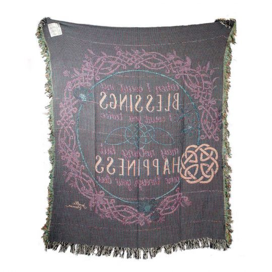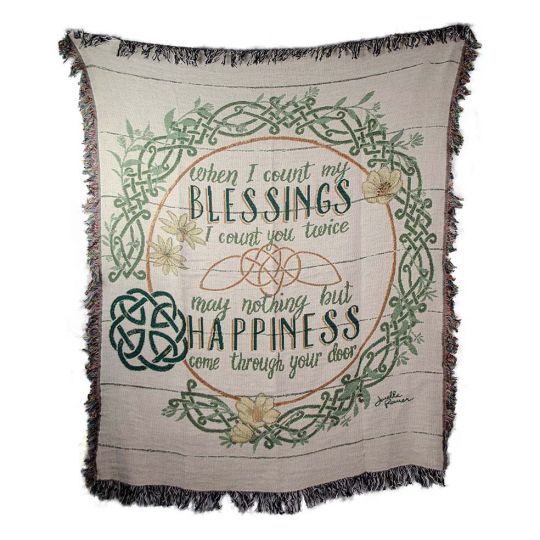 A lovely throw of Irish blessings�"When I count my blessings I count you twice" and "May nothing but happiness come through your door" - the author is unknown for both of these blessings but still powerful and appropriate for any occasion gift. A Celtic knot wreath design surrounds the words. 50" x 60". Made in the USA.