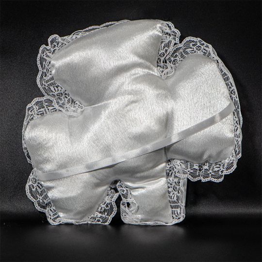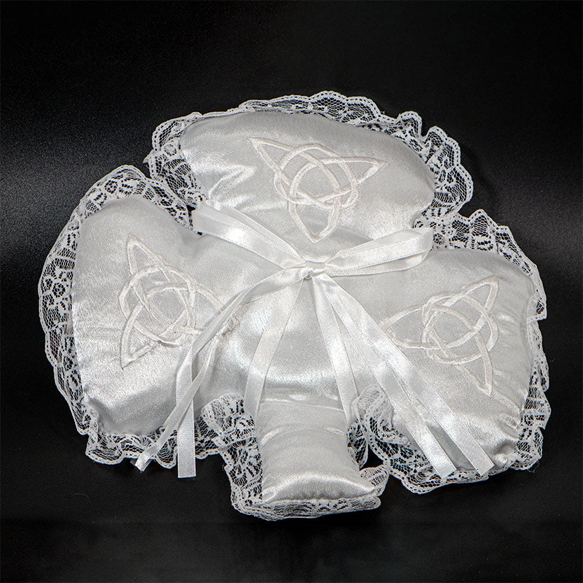 Shamrock wedding pillow with trinity knot design. This will make an Irish wedding complete. 10" x 10". Fabric. SALE ITEMS - due to the severely discounted price they are not returnable and are sold AS IS. We do our best to note in the description any known issues prevalent in an entire batch of items. Contact us if questions.