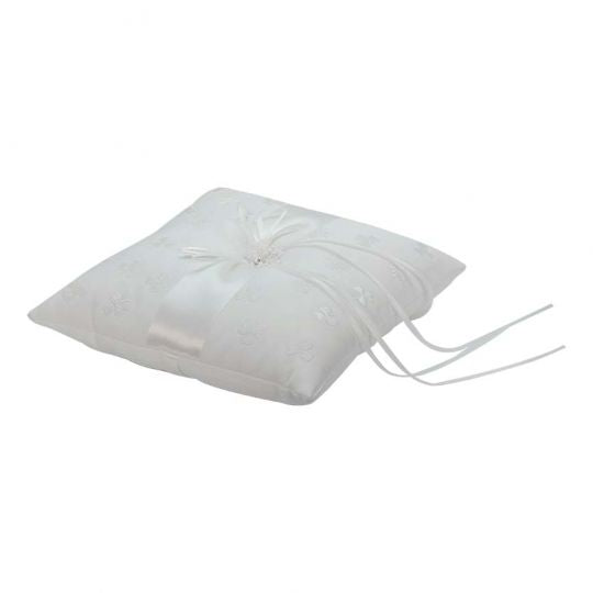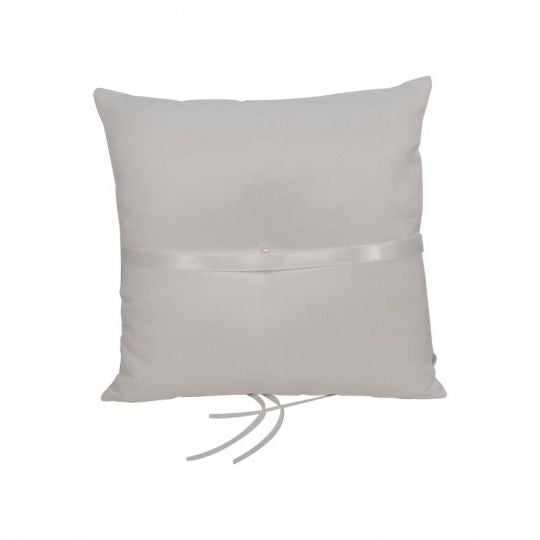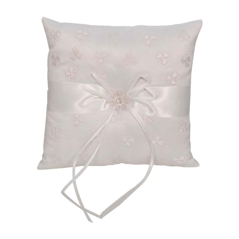 Just a perfect accessory for an Irish Wedding. This pillow has shamrocks embroidered all over the front along with a center adornment of ribbons, a flower applique, and pearls. It also has a carrying strap on the back so that that little ring bearer keeps hold. 8.25" x 8.25"
