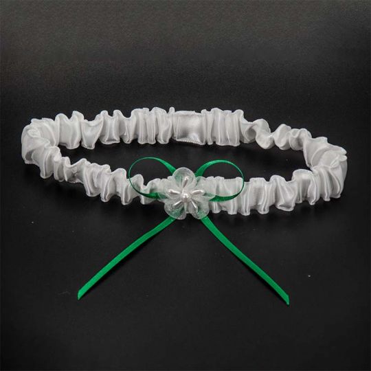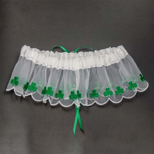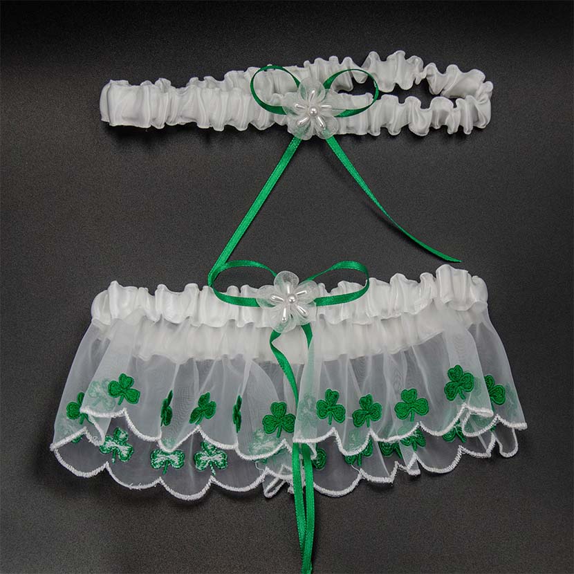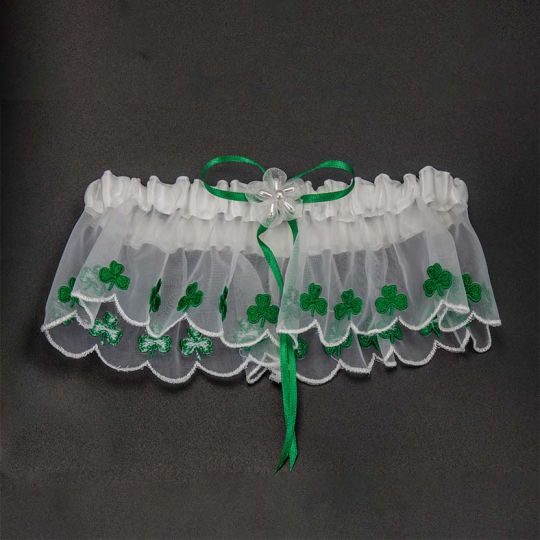 Every Irish bride wants a Irish Garter for her wedding day. However, this all white with green shamrocks set goes one step further and includes 2 garters - one for the bride to keep and another to throw away. One garter is trimmed in lace with green embroidered shamrocks. Both garters have a ribbon bow with rosette center. These come is a gift box with clear lid.