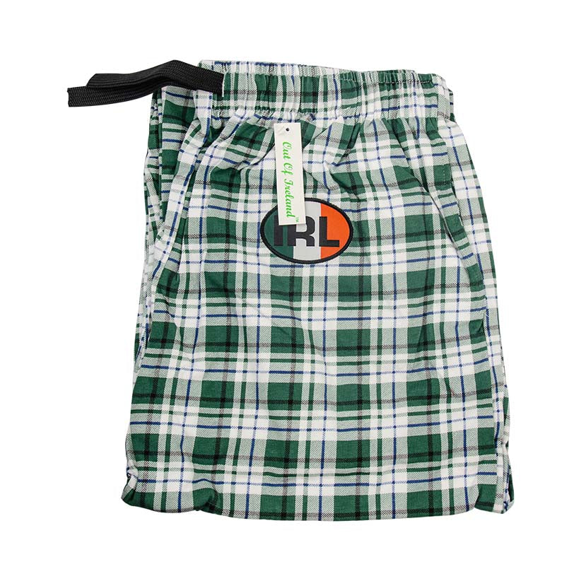 Adult unisex pajama/lounging pants. An IRL embroidered patch is attached to the front hip. Green and white plaid screams Irish.  Made of a soft and comfortable cotton material that is thick enough that it doesn't show everything yet not too warm to wear for all seasons. Pockets. Generously sized.  See also BOE347 - the short version of these pants.